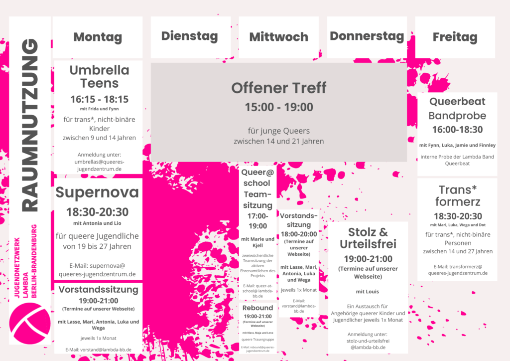 - Jeden Montag von 18:30 bis 20:30 Uhr: Supernova für queere Jugendliche von 19 bis 27 Jahren