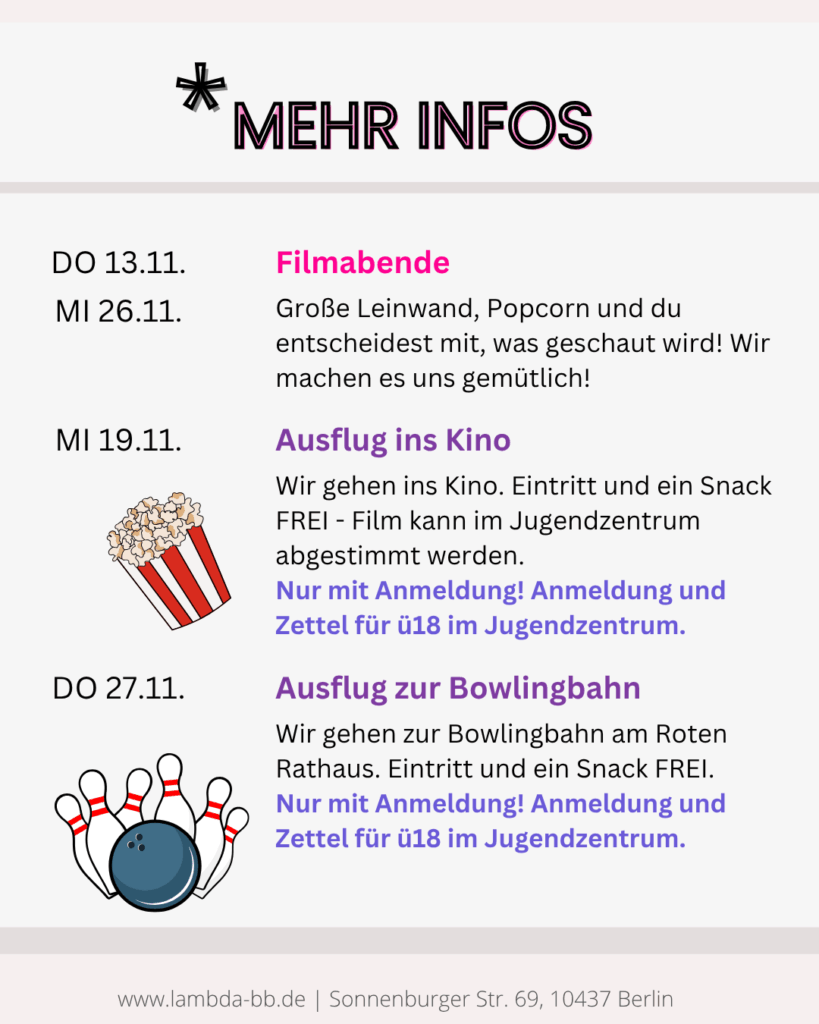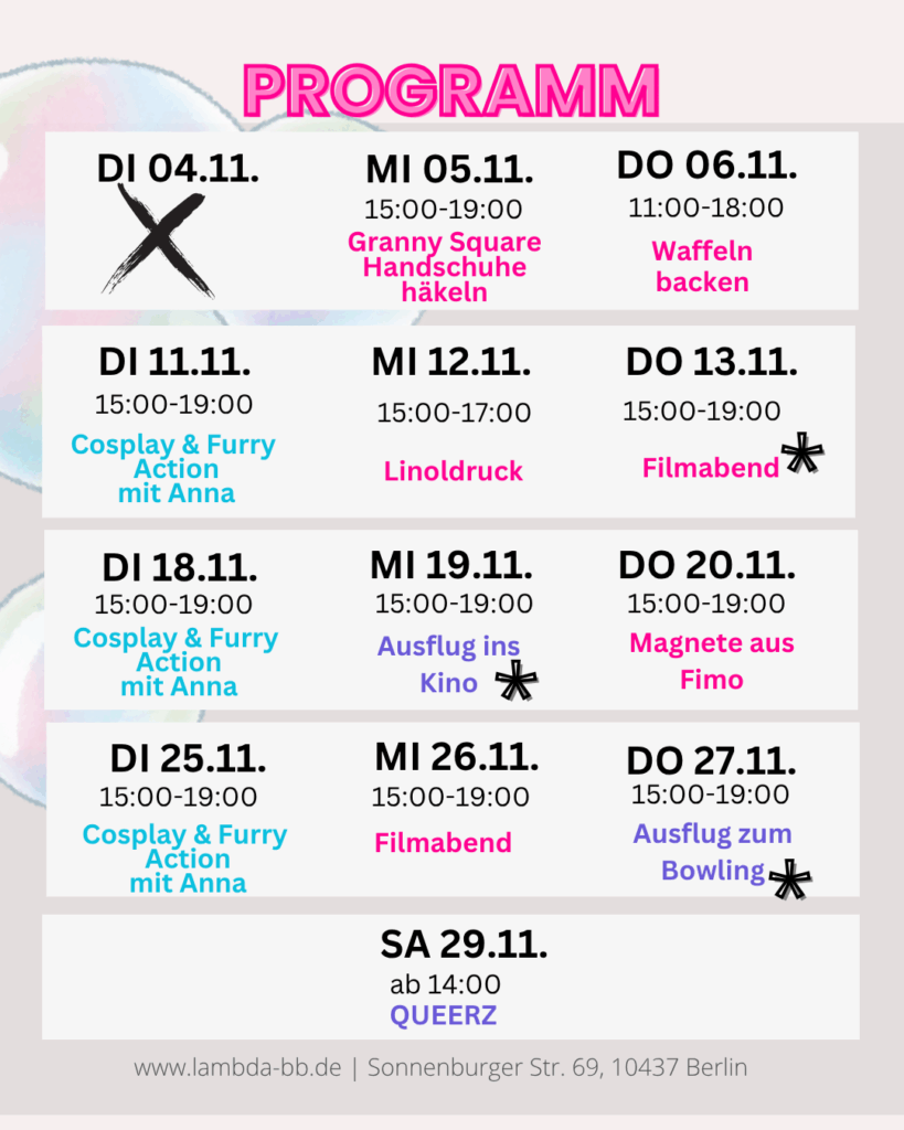 Das Queere Jugendzentrum von Lambda BB bietet einen barriere- und erwachsenenarmen Raum für queere Jugendliche und junge Erwachsene, in dem sie die Möglichkeit haben, ihre Freizeit zu gestalten, andere Queers kennenzulernen und sich auszutauschen.